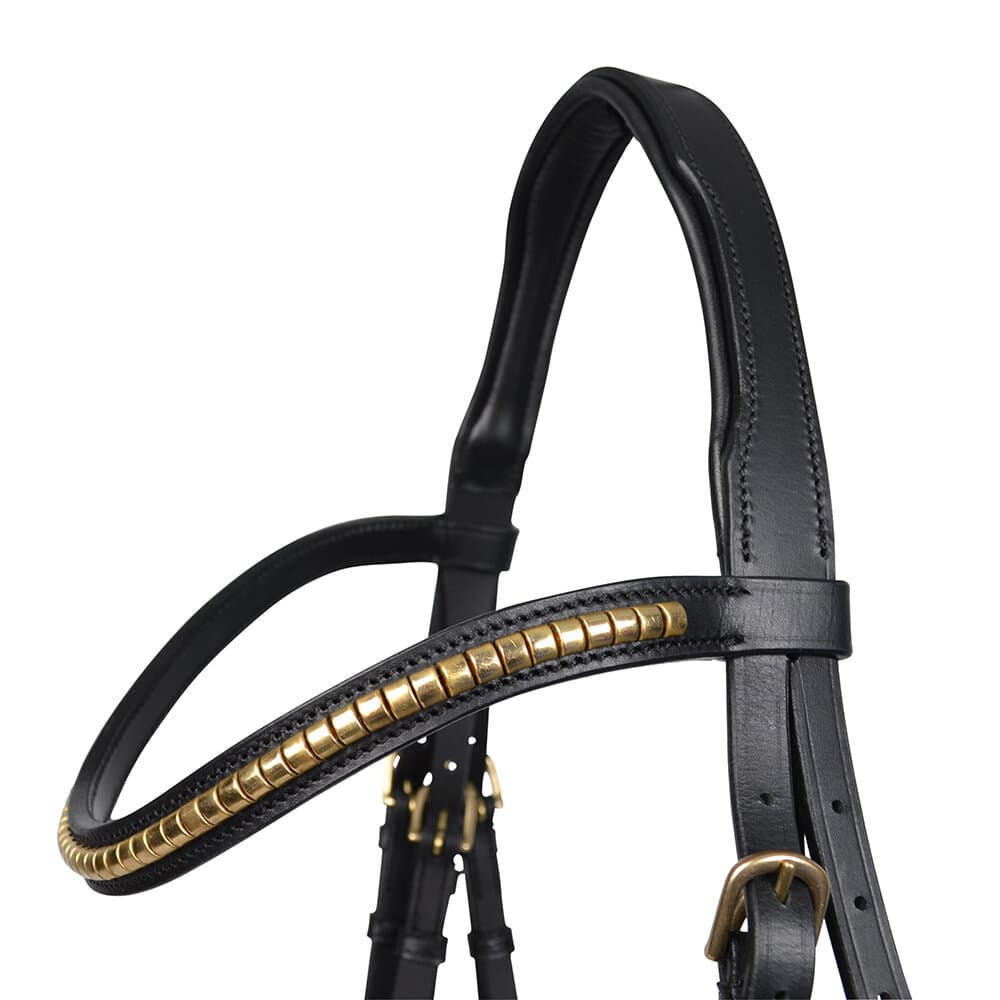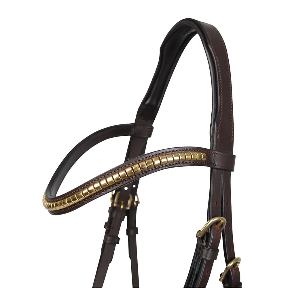 - Fodrad nosgrimma och nackstycke, dekorerade med mässingsfärgad clincher.