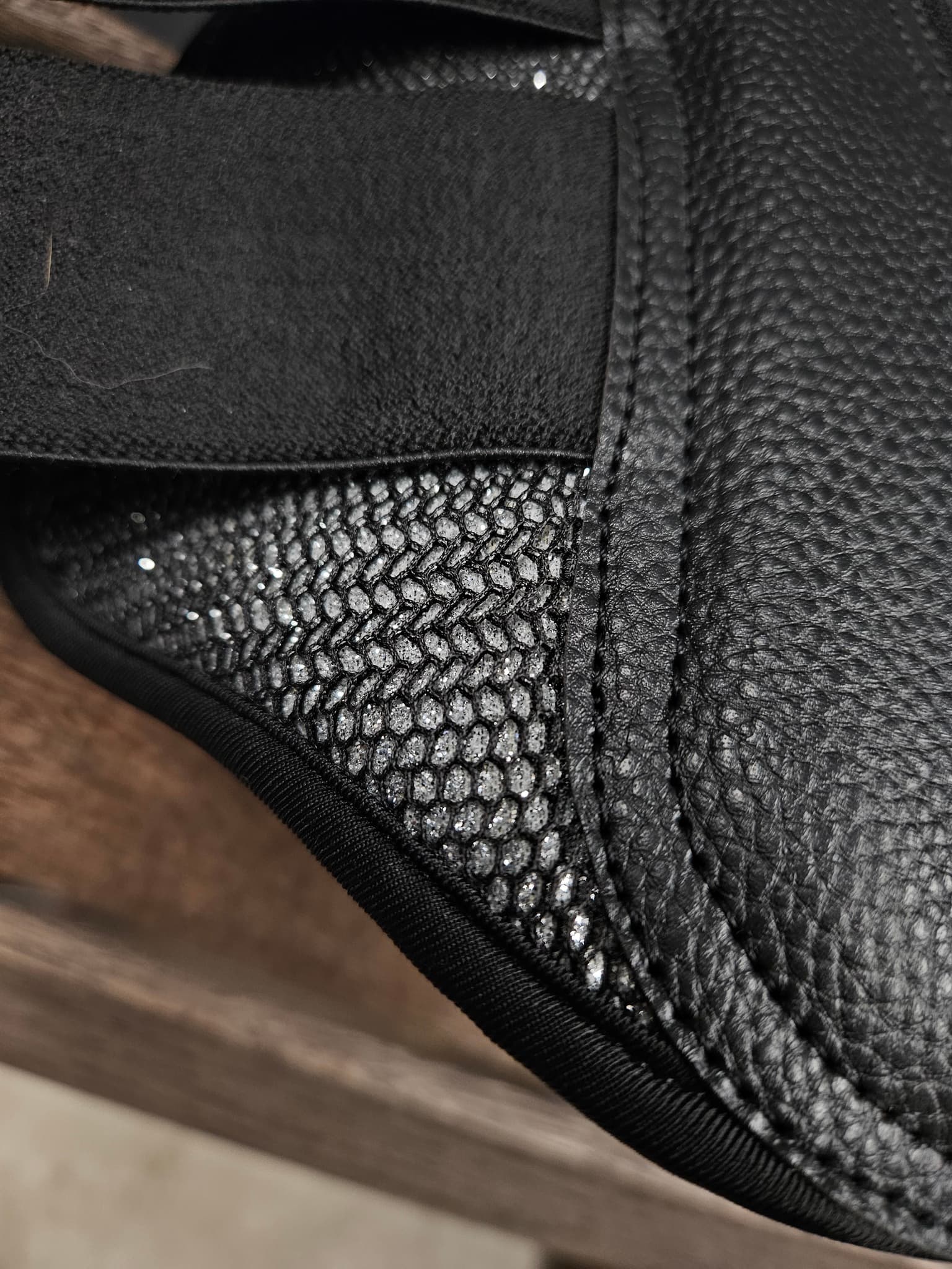 Glittrande meshutsida med strykkappa i konstläder.