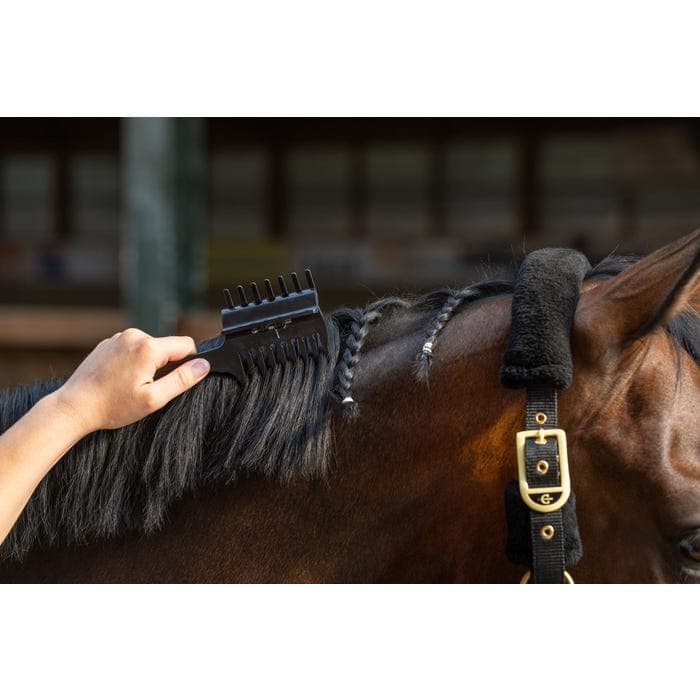 - Praktisk 3-i-1-kam med klämma och manbandshållare för enkel, jämn flätning av hästens man