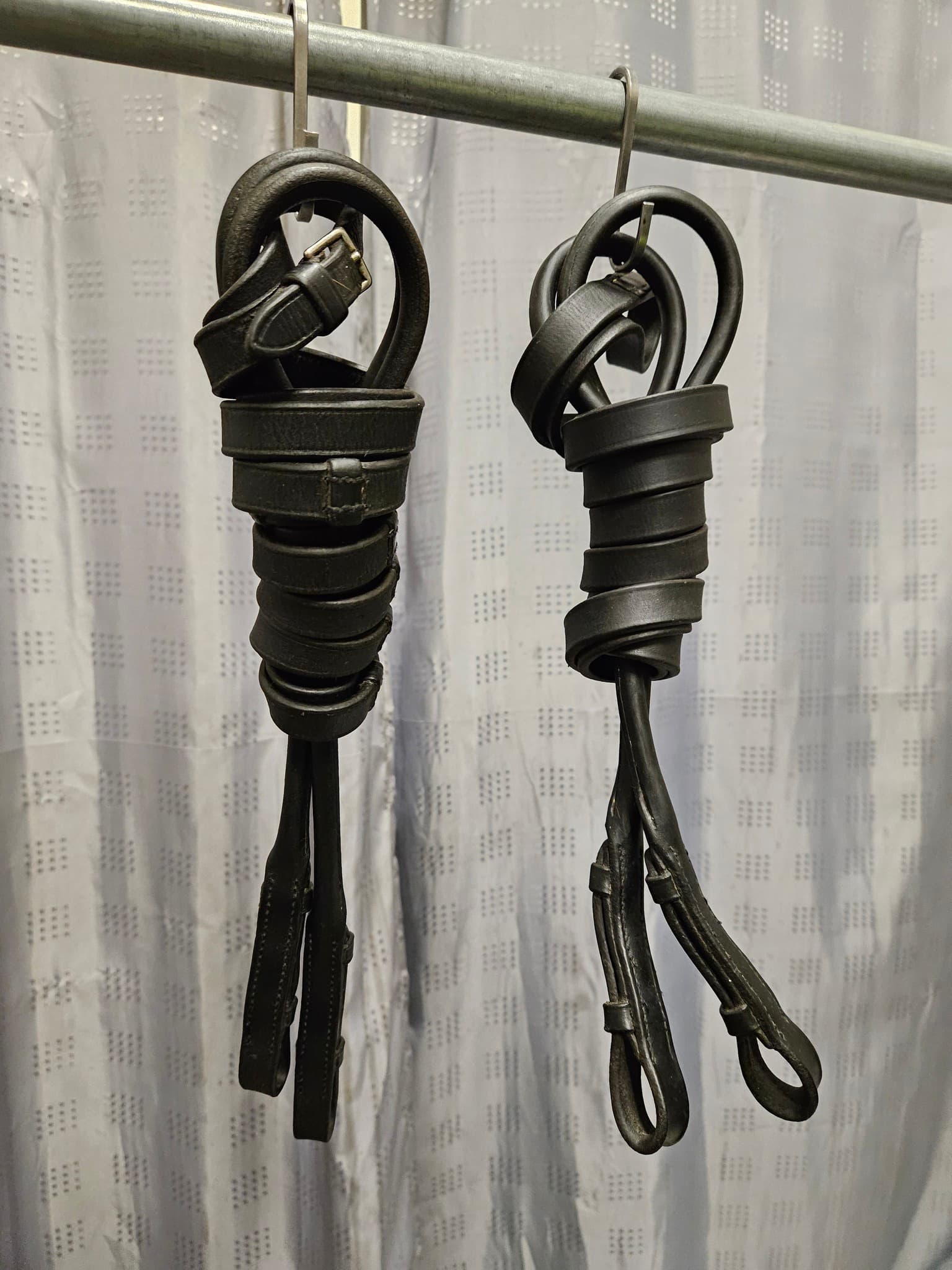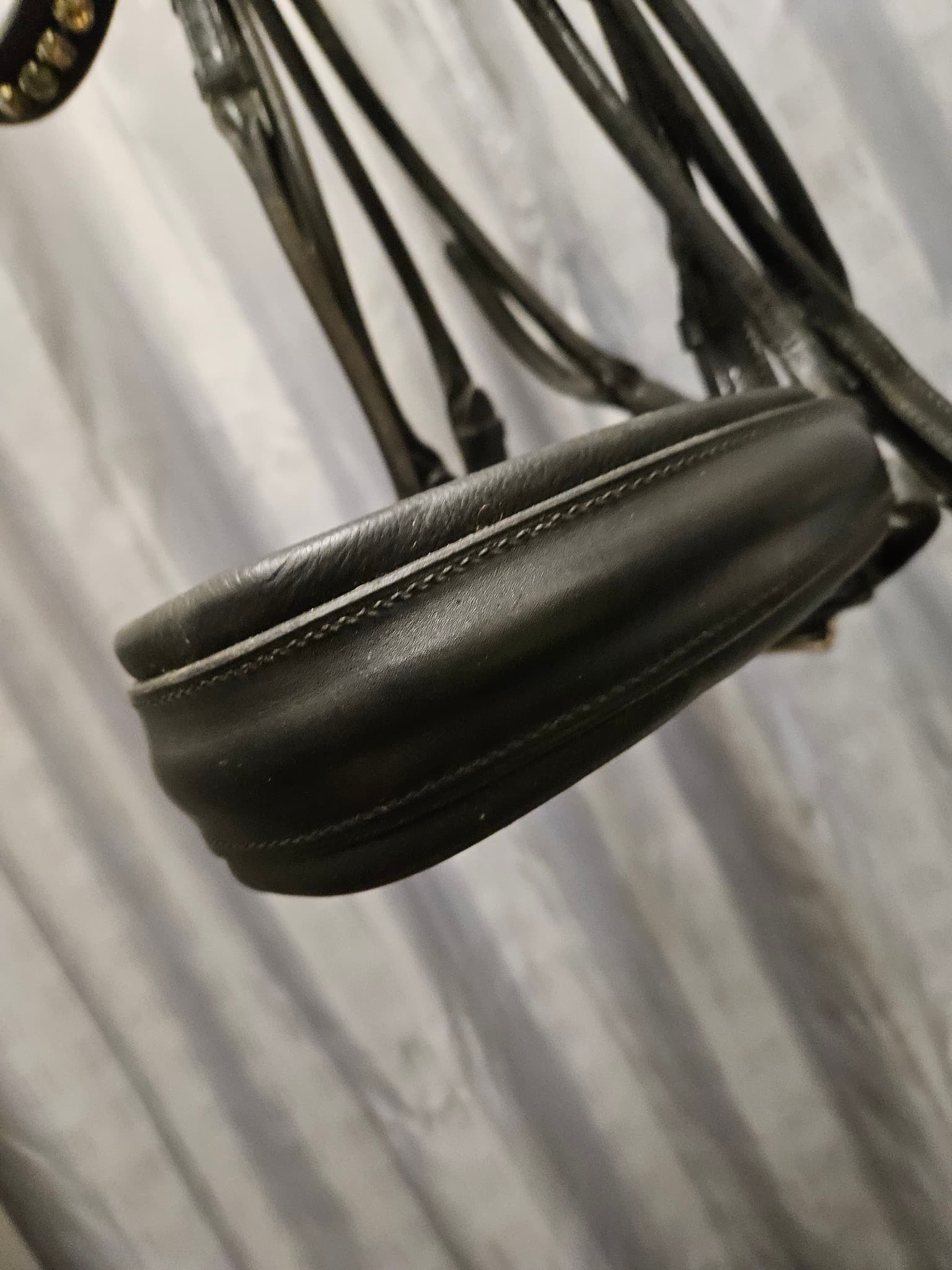 Inkl stångtygel och vanlig lädertygel med stoppar, rundsydda med hakar.