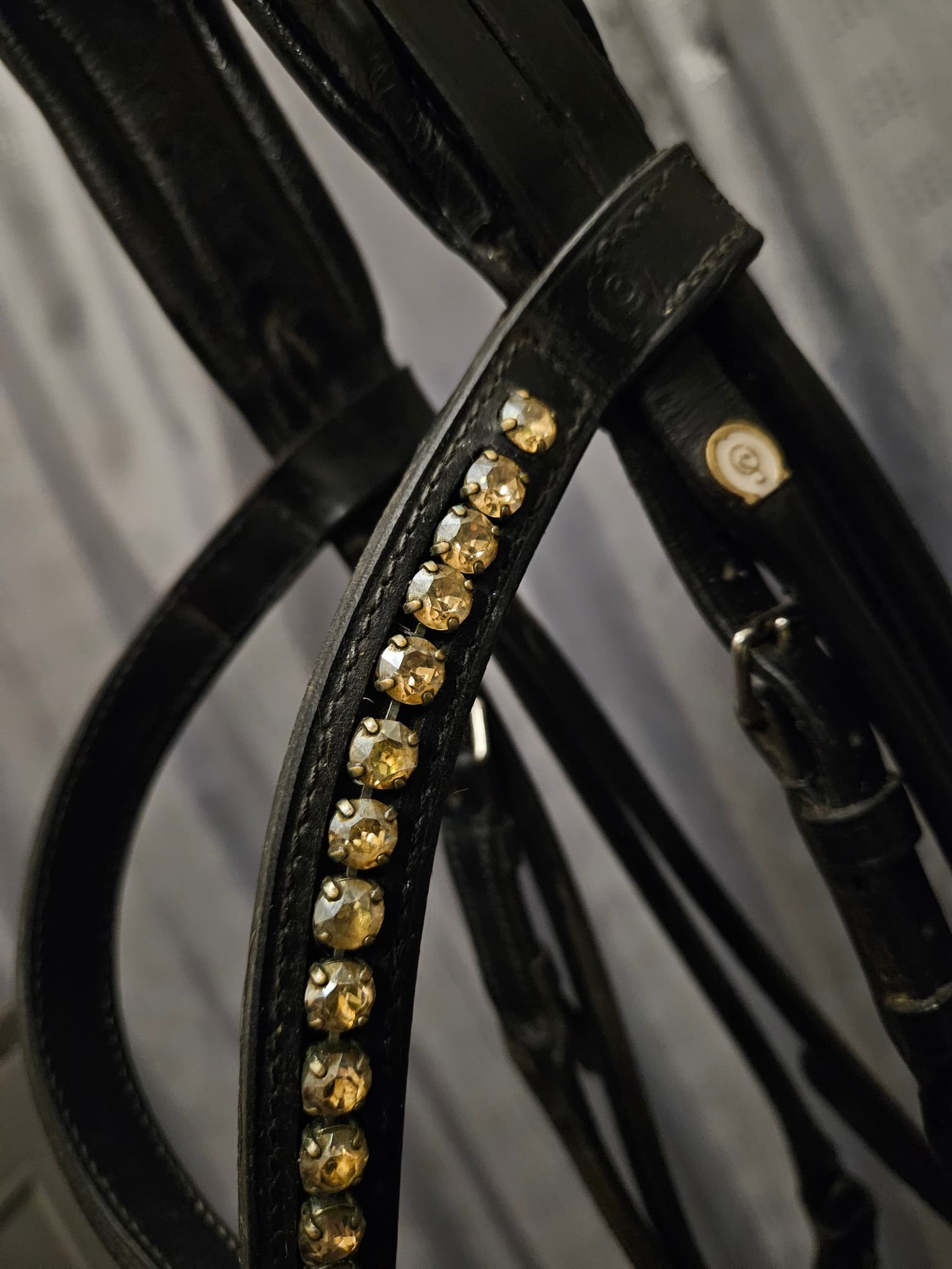 Guldiga swarovski-stenar på pannbandet.