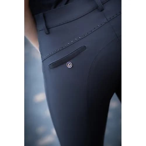 - Elegant ridbyxa med dekorativa ton-i-ton stenar på framfickor och bakok.