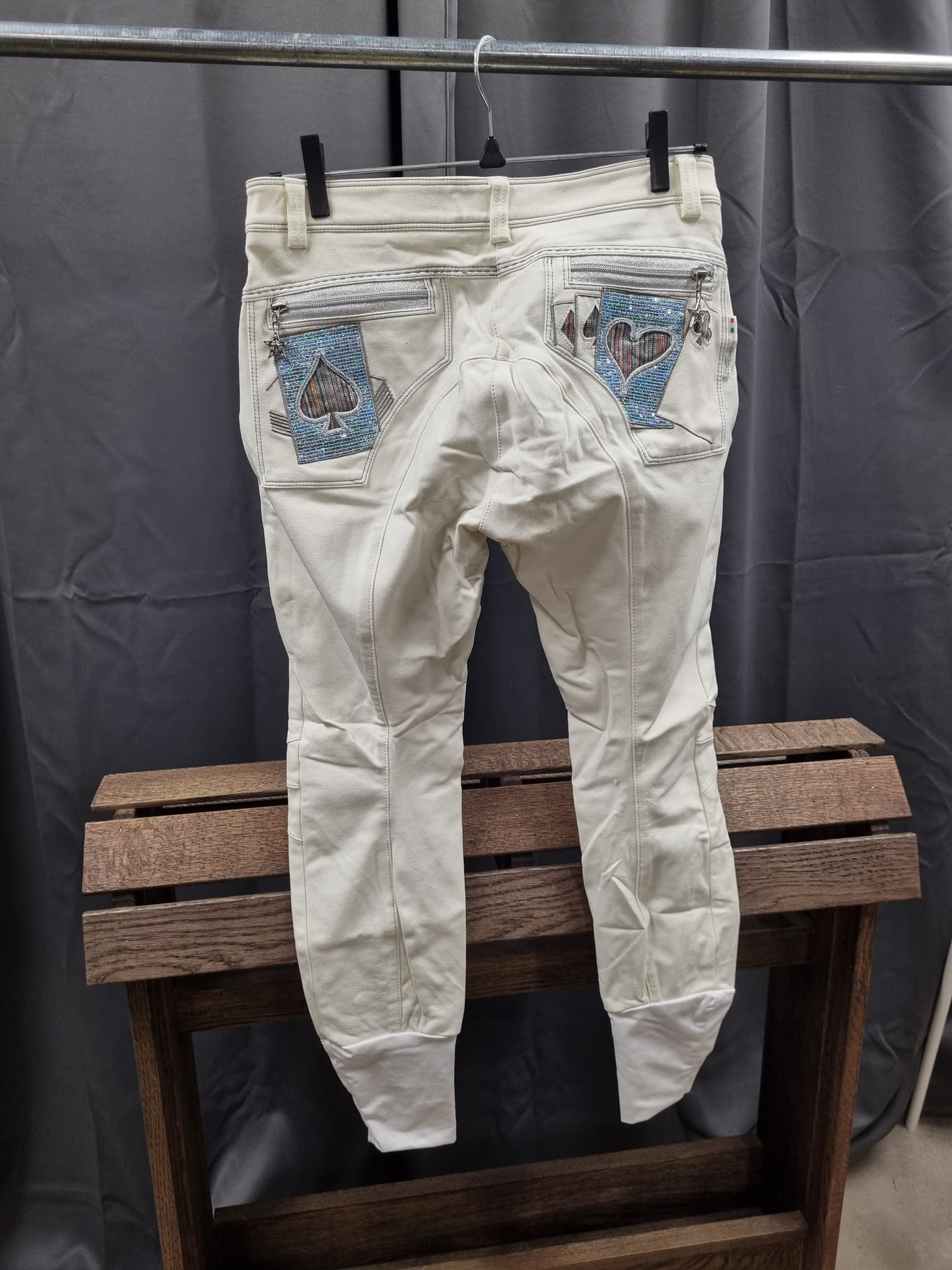 Paljettprydda bakfickor med silverglittrande dragkedja, dragtapp i form av stjärna med bling.